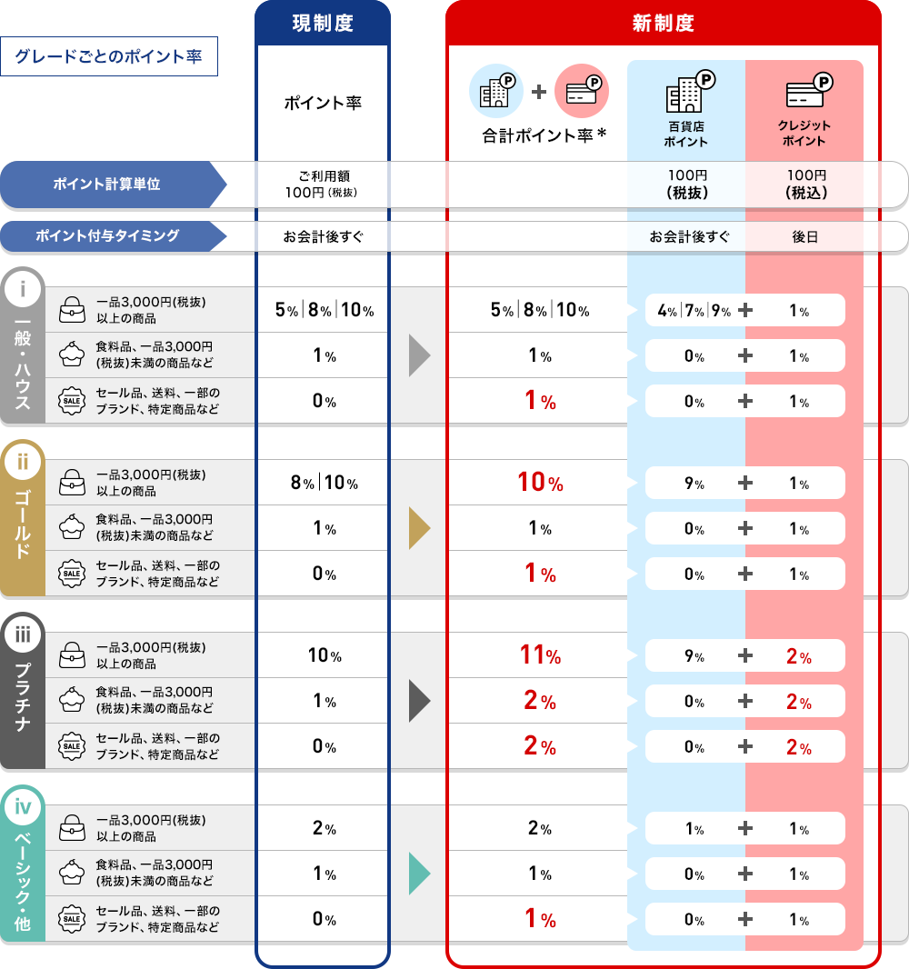 それに従い、百貨店ポイントのポイント還元率は1%下がり、クレジットポイントが1%になります。
